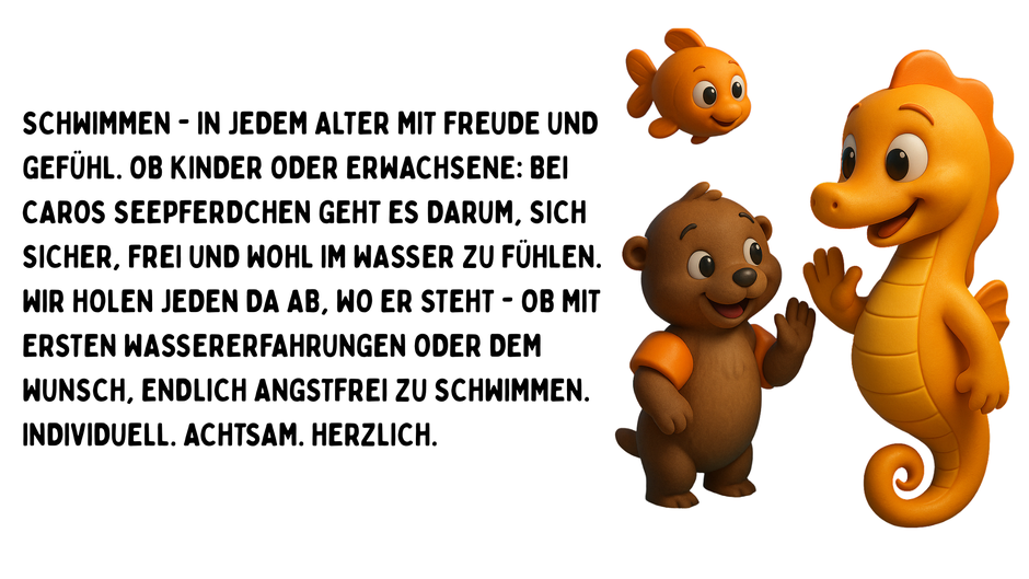 Wir sind Caros Seepferdchen. Mit Liebe schwimmen lernen – Schritt für Schritt ins Wasser-Vertrauen. Jedes Kind hat seinen eigenen Weg. Seit 2009 bin ich mit Herz und Seele im Wasser unterwegs – und jedes Kind, das wir begleiten dürfen, ist einzigartig. Darum folgen wir keinem starren Plan, sondern einem natürlichen Rhythmus: Wahrnehmen – Erleben – Denken – Handeln. Mit Spielen, Geschichten, Fantasie und ganz viel Gefühl entdecken Kinder das Wasser auf ihre Weise. Es geht nicht nur um Leistung, sondern um Vertrauen.